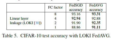 Answer to question 2: Let us take the case of LOKI, our previous work which defines the state-of-the-art attack in FL. Here as the Fully Connected layer becomes larger (FC factor is higher) then a larger proportion of images is leaked. We see that this has some effect on accuracy of the trained model, but the falloff is not dramatic. Thus, even with reasonably small-sized FC layer to leak the data, it is possible to help in the training of the downstream model.