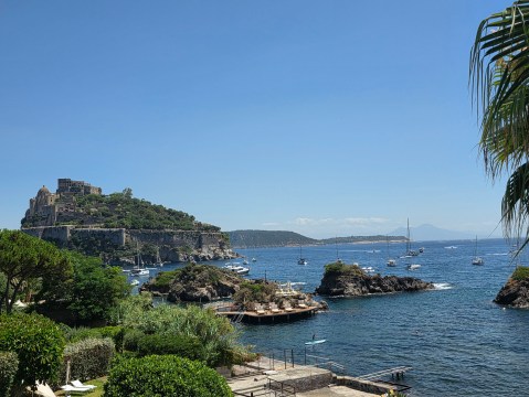 In the second part of our Italy trip, we get to Ischia, an island off the Gulf of Naples. It is an island of 65,000 residents and 4 million tourists. It is a fairly large island, the largest of the three off Naples, the others being Capri and Procida. An inexpensive hydrofoil ride takes us from Naples to Ischia and emphasizes what I had read — this ferry ride is utilitarian in its speed and enjoyable ticket fares, as well poetic. The ferry ride is poetic as it takes you on the journey through the Gulf of Naples for an hour and a little over, with wonderful vistas of the coastline and pristine waters. For quite long stretches of the journey, there is only the aquamarine water, rocky outcrops with trees bending over the water, and the wake left behind the ferry.