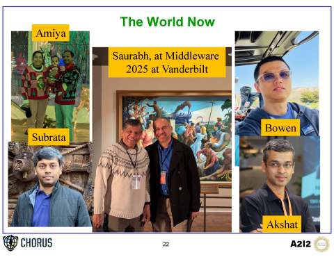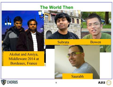 The work was started when the lead author, Amiya, went for an internship to IBM Research and then continued that work after he came back to Purdue. Our IBM co-author, Akshat, provided a compelling real-world technical challenge to Amiya and then defined the constraints and the requirements for a credible solution. While developing the solution, Amiya realized he needed more heads for the design and more hands for the implementation and evaluation and that’s how two other PhD students in our group, Subrata and Bowen got involved. We submitted the work to the Middleware 2014 Conference where it was one of 27 regular papers that got accepted, for an acceptance rate of 18.75%. The conference was held in Bordeaux in France, a region famous for its eponymous wine, in December 2014. Amiya and Akshat attended.